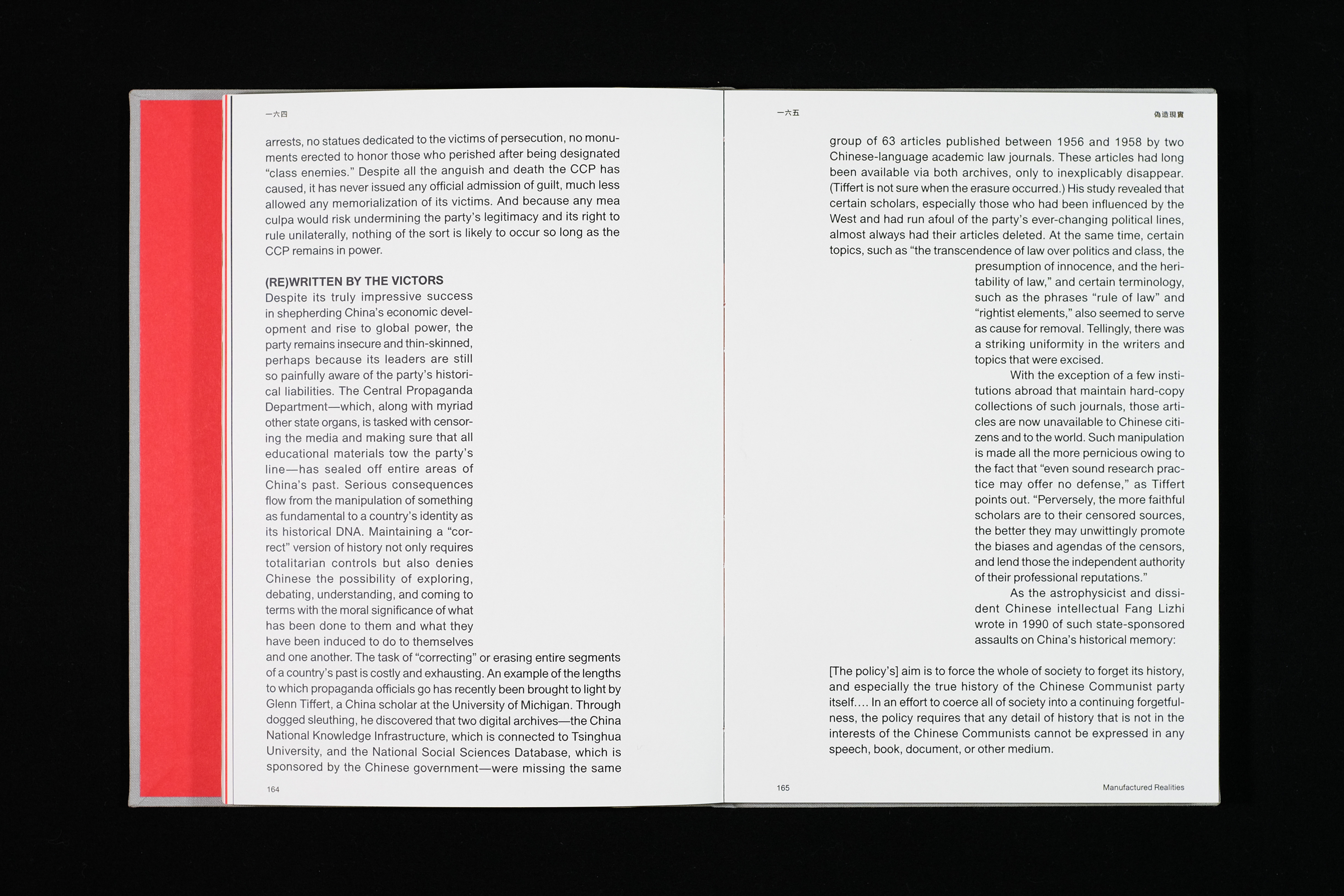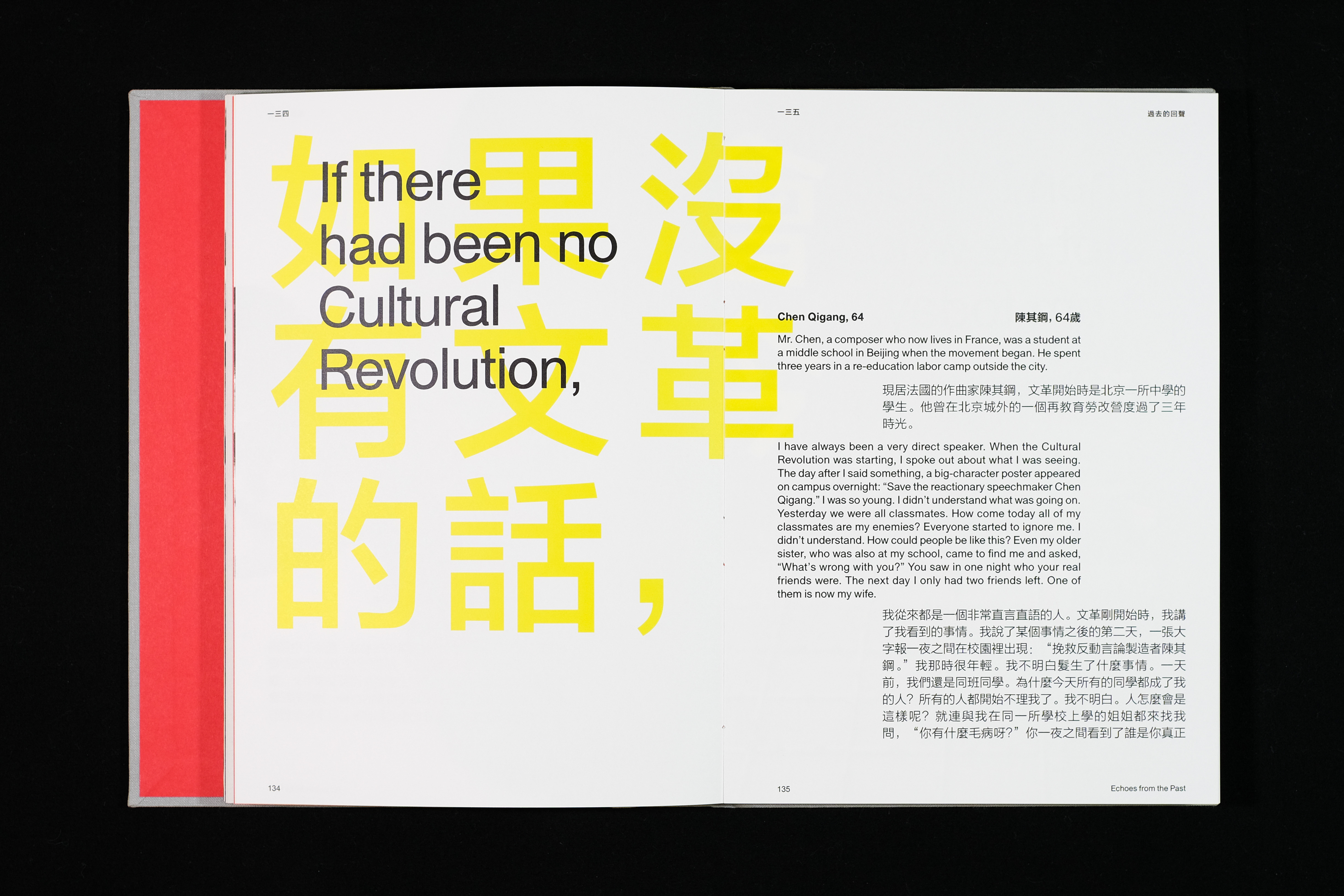The interactive installation is a spatial extension of the book that continues the narrative in The East Runs Red beyond print design. The dual timelines provide visual information of major events in modern China and its juxtaposition to notable wuxia and kung fu film releases provide users to draw causal–correlation connections between the two. To augment the experience, the timelines are equipped with code and a sensor that detects user presence in the space between the projections to allow them to pace their own read.
